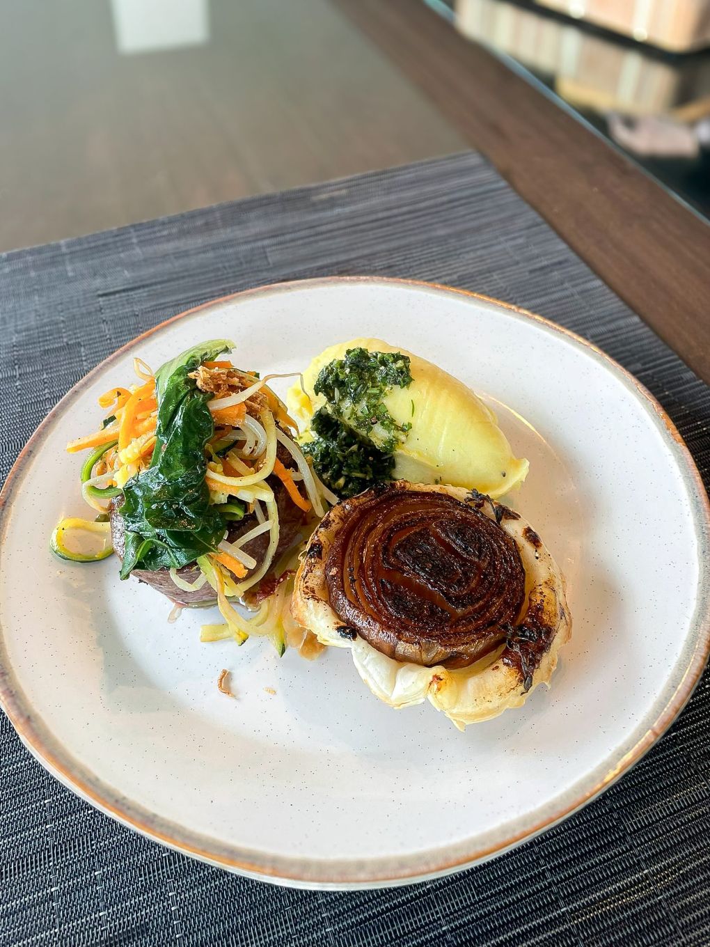 • Fillet of beef, red onion tarte Tatin, mashed potatoes and gremolata