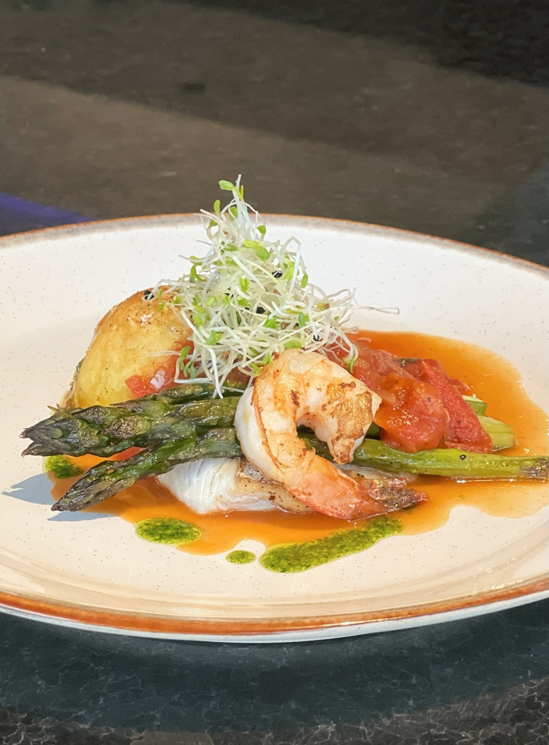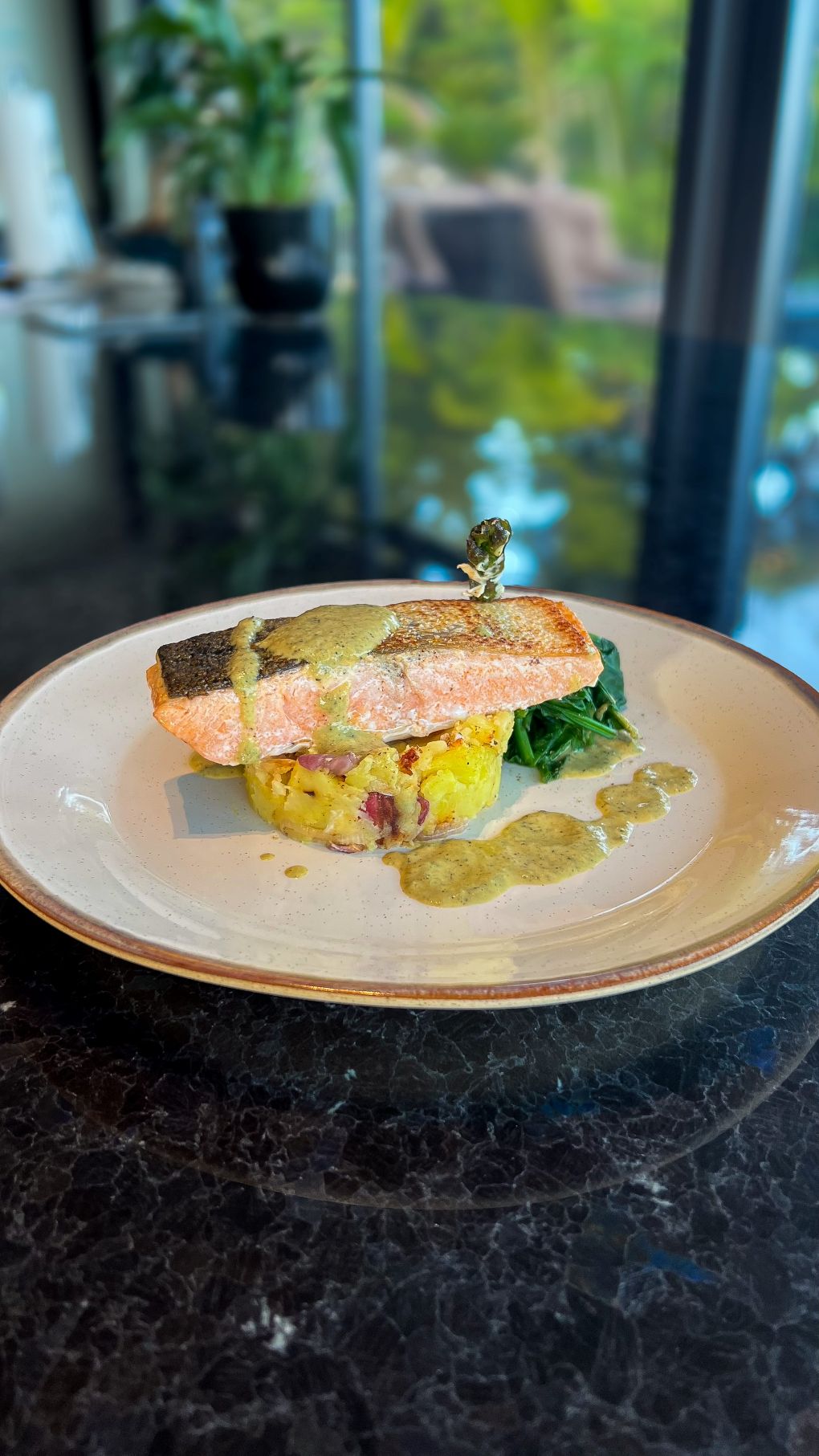 • Seared Mount Cook Salmon, crushed potatoes, burnt asparagus sauce
