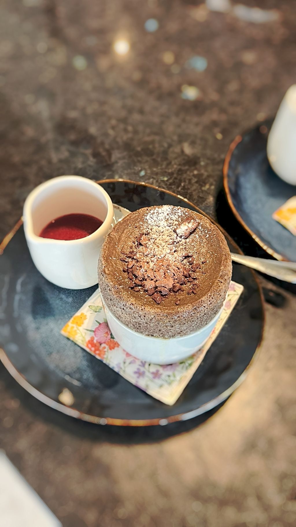 • Hot chocolate soufflé, raspberry sauce